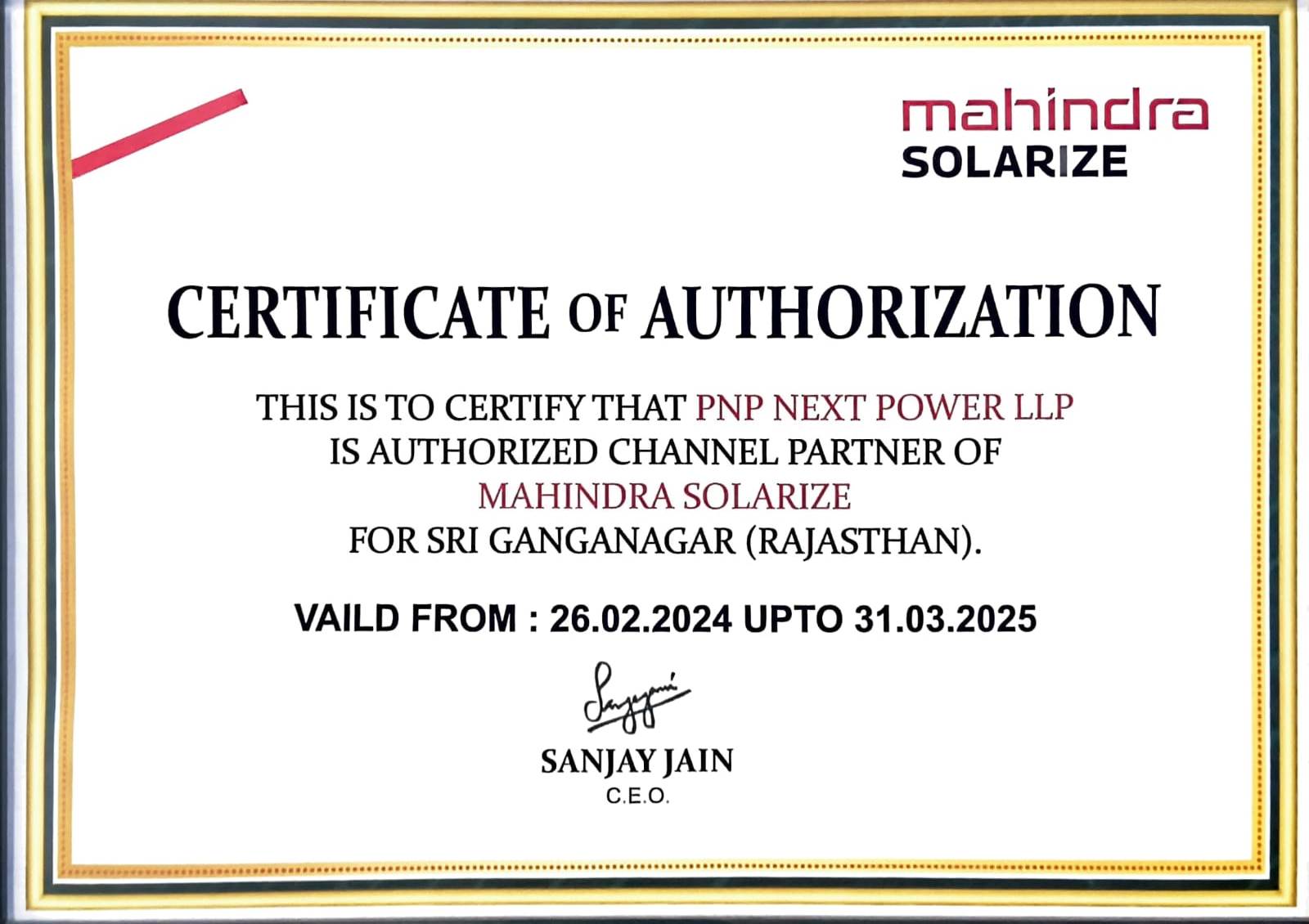 Authorized Channel Partner of Mahindra Solarize Pvt. Ltd.